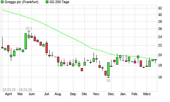 Mit dem Rücksetzer auf 19,10 EUR hat die Greggs-Aktie am 17.03.2026 die 200-Tage-Linie nach unten gekreuzt.