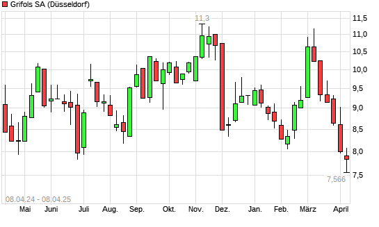 Mit dem Rücksetzer auf 7,60 EUR hat die Grifols-Aktie (ISIN ES0171996087) am 07.04.2025 ein neues 12-Monats-Tief erreicht und damit den Kurs vom 27.06.2024 eingestellt.