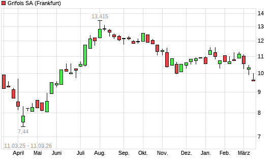 Mit dem Rücksetzer auf 9,80 EUR hat die Grifols-Aktie (ISIN ES0171996087) am 10.03.2026 ein neues 6-Monats-Tief erreicht und damit den Kurs vom 09.03.2026 eingestellt.