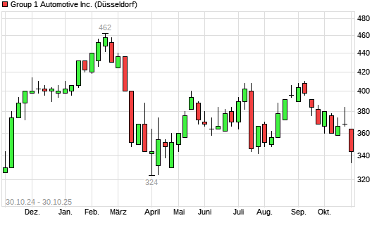 Mit dem Rücksetzer auf 338,00 EUR hat die Group 1 Automotive-Aktie (ISIN US3989051095) am 29.10.2025 ein neues 6-Monats-Tief erreicht und damit den Kurs vom 18.07.2025 eingestellt.