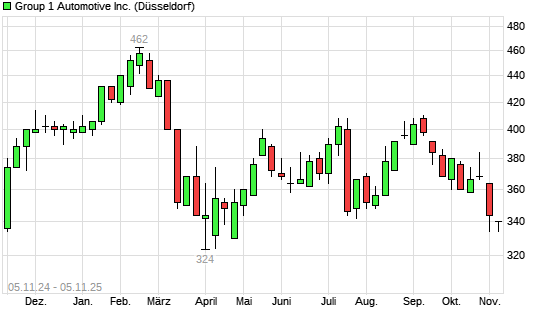 Mit dem Rücksetzer auf 334,00 EUR hat die Group 1 Automotive-Aktie (ISIN US3989051095) am 04.11.2025 ein neues 6-Monats-Tief erreicht und damit den Kurs vom 29.10.2025 eingestellt.
