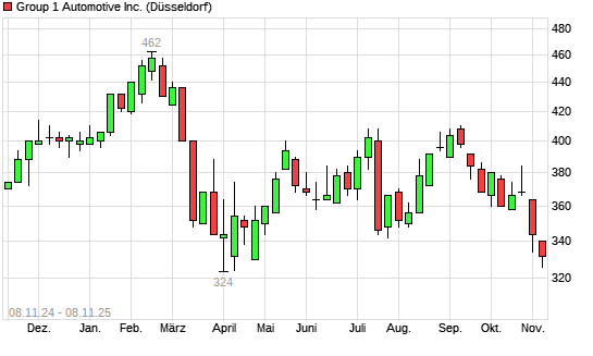 Mit dem Rücksetzer auf 332,00 EUR hat die Group 1 Automotive-Aktie (ISIN US3989051095) am 07.11.2025 ein neues 6-Monats-Tief erreicht und damit den Kurs vom 04.11.2025 eingestellt.