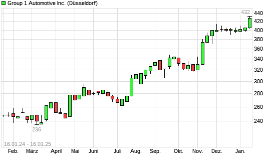 Mit dem Anstieg auf 422,00 EUR hat die Group 1 Automotive-Aktie (ISIN US3989051095) am 15.01.2025 ein neues All-Time-High erreicht und damit den Kurs vom 14.01.2025 eingestellt.