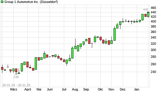 Mit dem Anstieg auf 440,00 EUR hat die Group 1 Automotive-Aktie (ISIN US3989051095) am 29.01.2025 ein neues All-Time-High erreicht und damit den Kurs vom 28.01.2025 eingestellt.