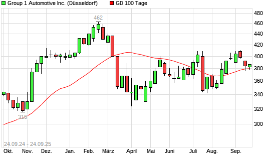 Mit dem Rücksetzer auf 378,00 EUR hat die Group 1 Automotive-Aktie am 23.09.2025 die 100-Tage-Linie nach unten gekreuzt.