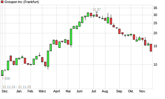Mit dem Rücksetzer auf 13,84 EUR hat die Groupon-Aktie (ISIN US3994732069) am 20.11.2025 ein neues 6-Monats-Tief erreicht und damit den Kurs vom 19.11.2025 eingestellt.