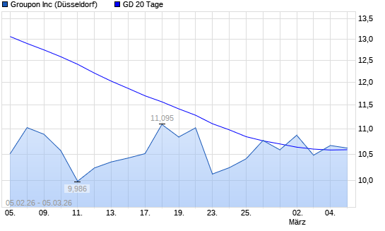Mit dem Anstieg auf 10,69 EUR hat die Groupon-Aktie am 04.03.2026 die 20-Tage-Linie nach oben gekreuzt.Die Groupon-Aktie befindet sich seit dem 01.10.2025 im langfristigen Abwärtstrend ...weiterlesen