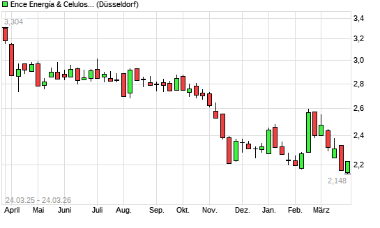 Mit dem Rücksetzer auf 2,13 EUR hat die Grupo Empresarial Ence-Aktie (ISIN ES0130625512) am 23.03.2026 ein neues 3-Jahres-Tief erreicht und damit den Kurs vom 02.02.2026 eingestellt.