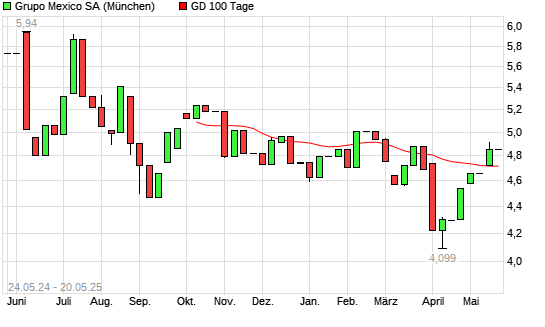 Mit dem Rücksetzer auf 4,71 EUR hat die Grupo Mexico-Aktie am 19.05.2025 die 100-Tage-Linie nach unten gekreuzt.