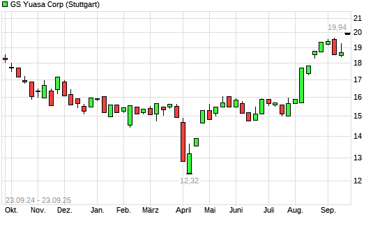 Mit dem Anstieg auf 19,78 EUR hat die Gs Yuasa-Aktie (ISIN JP3385820000) am 22.09.2025 ein neues 3-Jahres-Hoch erreicht und damit den Kurs vom 20.06.2024 eingestellt.