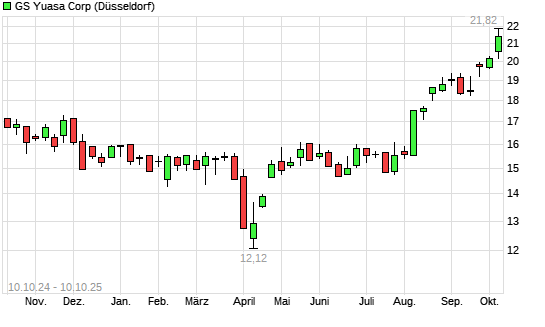 Mit dem Anstieg auf 21,60 EUR hat die Gs Yuasa-Aktie (ISIN JP3385820000) am 09.10.2025 ein neues 3-Jahres-Hoch erreicht und damit den Kurs vom 08.10.2025 eingestellt.