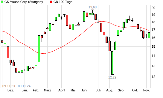 Mit dem Anstieg auf 17,23 EUR hat die Gs Yuasa-Aktie am 08.11.2024 die 100-Tage-Linie nach oben gekreuzt.