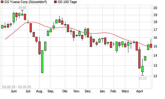 Mit dem Rücksetzer auf 14,64 EUR hat die Gs Yuasa-Aktie am 02.05.2025 die 100-Tage-Linie nach unten gekreuzt.