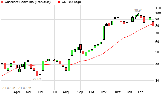 Mit dem Rücksetzer auf 83,26 EUR hat die Guardant Health-Aktie am 23.02.2026 die 100-Tage-Linie nach unten gekreuzt.Der Abstand zur 200-Tage-Linie beträgt aktuell +30,08%. ...weiterlesen