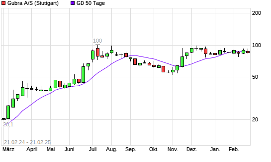 Mit dem Rücksetzer auf 85,00 EUR hat die Gubra-Aktie am 20.02.2025 die 50-Tage-Linie nach unten gekreuzt.