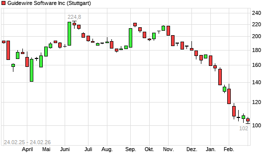 Mit dem Rücksetzer auf 102,60 EUR hat die Guidewire Software-Aktie (ISIN US40171V1008) am 23.02.2026 ein neues 12-Monats-Tief erreicht und damit den Kurs vom 17.02.2026 eingestellt.