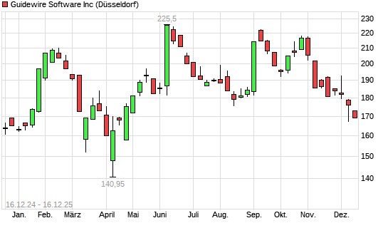 Mit dem Rücksetzer auf 164,90 EUR hat die Guidewire Software-Aktie (ISIN US40171V1008) am 15.12.2025 ein neues 6-Monats-Tief erreicht und damit den Kurs vom 09.12.2025 eingestellt.