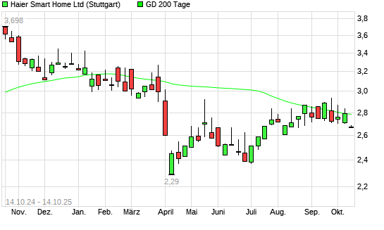 Mit dem Rücksetzer auf 2,68 EUR hat die HAIER SMART HOME H-Aktie am 13.10.2025 die 200-Tage-Linie nach unten gekreuzt.
