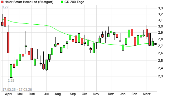 Mit dem Rücksetzer auf 2,72 EUR hat die HAIER SMART HOME H-Aktie am 16.03.2026 die 200-Tage-Linie nach unten gekreuzt.