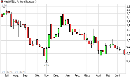 Mit dem Rücksetzer auf 0,78 EUR hat die HEALWELL AI CL.A SUB.VTG-Aktie (ISIN CA42249X1006) am 20.06.2025 ein neues 6-Monats-Tief erreicht und damit den Kurs vom 04.04.2025 eingestellt.