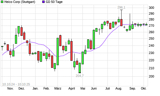 Mit dem Anstieg auf 274,50 EUR hat die HEICO-Aktie am 09.10.2025 die 50-Tage-Linie nach oben gekreuzt.