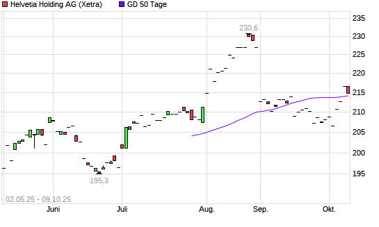 Mit dem Anstieg auf 214,40 EUR hat die HELVETIA HOLDING N1-Aktie am 08.10.2025 die 50-Tage-Linie nach oben gekreuzt.