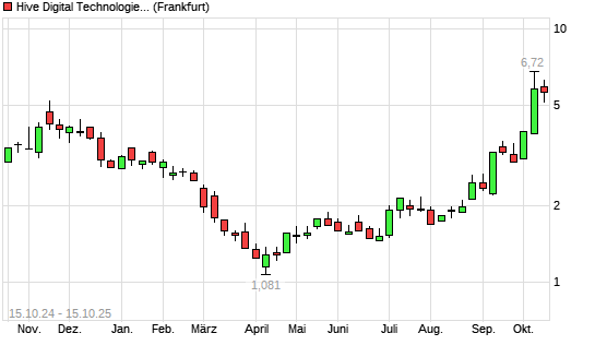 Mit dem Anstieg auf 6,09 EUR hat die HIVE Blockchain Technologies-Aktie (ISIN CA4339211035) am 14.10.2025 ein neues 3-Jahres-Hoch erreicht und damit den Kurs vom 09.10.2025 eingestellt.