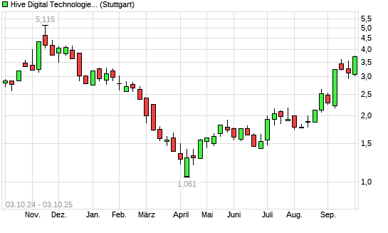 Mit dem Anstieg auf 3,67 EUR hat die HIVE Blockchain Technologies-Aktie (ISIN CA4339211035) am 02.10.2025 ein neues 6-Monats-Hoch erreicht und damit den Kurs vom 01.10.2025 eingestellt.