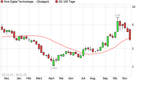 Mit dem Rücksetzer auf 2,85 EUR hat die HIVE Blockchain Technologies-Aktie am 14.11.2025 die 100-Tage-Linie nach unten gekreuzt.