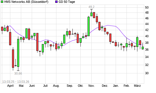 Mit dem Rücksetzer auf 37,02 EUR hat die HMS INDUSTRIAL NETWORKS-Aktie am 12.03.2026 die 50-Tage-Linie nach unten gekreuzt.