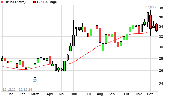 Mit dem Rücksetzer auf 32,60 EUR hat die HP-Aktie am 11.12.2024 die 100-Tage-Linie nach unten gekreuzt.