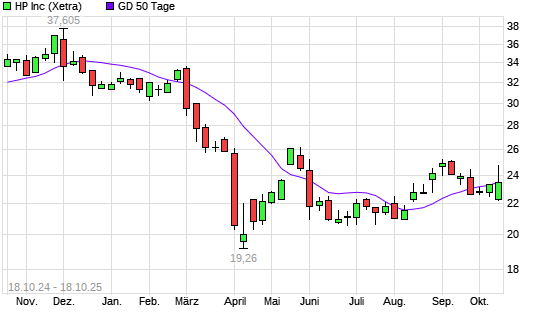 Mit dem Rücksetzer auf 23,47 EUR hat die HP-Aktie am 17.10.2025 die 50-Tage-Linie nach unten gekreuzt.