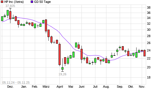 Mit dem Rücksetzer auf 23,02 EUR hat die HP-Aktie am 04.11.2025 die 50-Tage-Linie nach unten gekreuzt.
