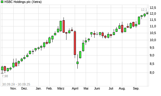 Mit dem Anstieg auf 12,08 EUR hat die HSBC Holdings-Aktie (ISIN GB0005405286) am 29.09.2025 ein neues 10-Jahres-Hoch erreicht und damit den Kurs vom 23.09.2025 eingestellt.
