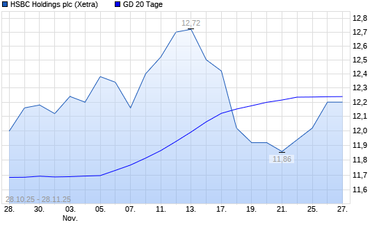 Mit dem Rücksetzer auf 12,20 EUR hat die HSBC Holdings-Aktie am 27.11.2025 die 20-Tage-Linie nach unten gekreuzt.