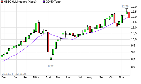 Mit dem Rücksetzer auf 11,78 EUR hat die HSBC Holdings-Aktie am 21.11.2025 die 50-Tage-Linie nach unten gekreuzt.