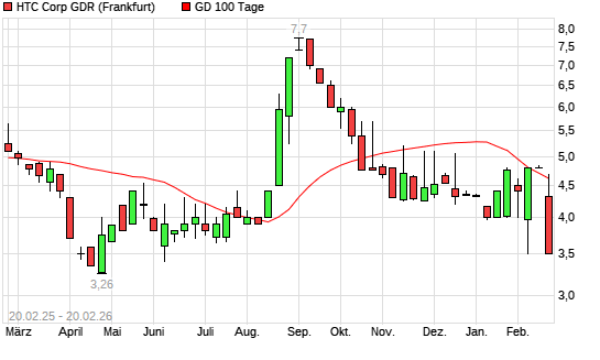 Mit dem Rücksetzer auf 3,50 EUR hat die HTC GDR-Aktie am 19.02.2026 die 100-Tage-Linie nach unten gekreuzt.Die HTC GDR-Aktie befindet sich seit dem 18.02.2026 im ...weiterlesen