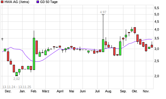 Mit dem Rücksetzer auf 3,17 EUR hat die HWA-Aktie am 12.11.2025 die 50-Tage-Linie nach unten gekreuzt.