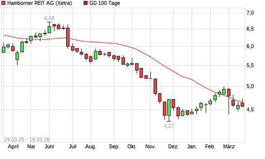 Mit dem Rücksetzer auf 4,62 EUR hat die Hamborner REIT-Aktie am 18.03.2026 die 100-Tage-Linie nach unten gekreuzt.