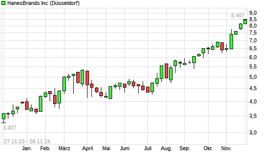 Mit dem Anstieg auf 8,38 EUR hat die Hanesbrands-Aktie (ISIN US4103451021) am 25.11.2024 ein neues 12-Monats-Hoch erreicht und damit den Kurs vom 21.11.2024 eingestellt.