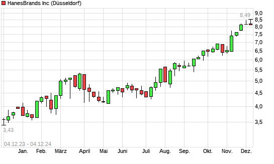 Mit dem Anstieg auf 8,46 EUR hat die Hanesbrands-Aktie (ISIN US4103451021) am 03.12.2024 ein neues 12-Monats-Hoch erreicht und damit den Kurs vom 25.11.2024 eingestellt.