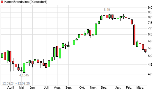 Mit dem Rücksetzer auf 5,36 EUR hat die Hanesbrands-Aktie (ISIN US4103451021) am 11.03.2025 ein neues 6-Monats-Tief erreicht und damit den Kurs vom 06.03.2025 eingestellt.