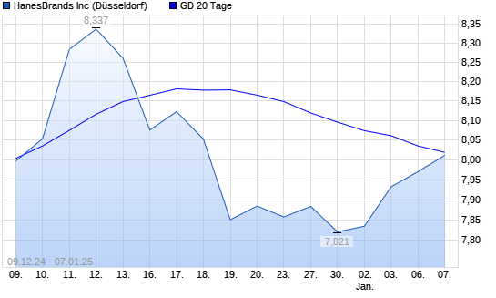 Mit dem Anstieg auf 7,96 EUR hat die Hanesbrands-Aktie am 06.01.2025 die 20-Tage-Linie nach oben gekreuzt.