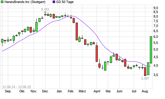 Mit dem Anstieg auf 4,13 EUR hat die Hanesbrands-Aktie am 11.08.2025 die 50-Tage-Linie nach oben gekreuzt.