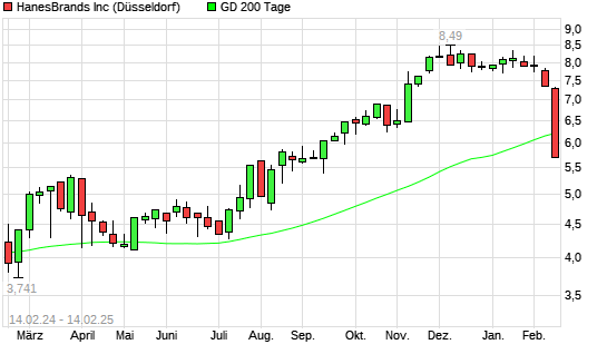 Mit dem Rücksetzer auf 6,04 EUR hat die Hanesbrands-Aktie am 13.02.2025 die 200-Tage-Linie nach unten gekreuzt.