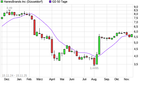 Mit dem Rücksetzer auf 5,62 EUR hat die Hanesbrands-Aktie am 14.11.2025 die 50-Tage-Linie nach unten gekreuzt.