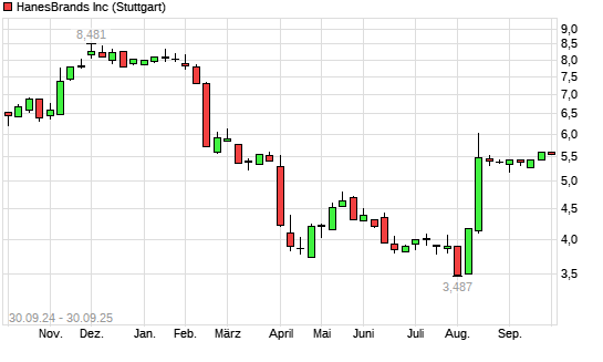 Mit dem Anstieg auf 5,60 EUR hat die Hanesbrands-Aktie (ISIN US4103451021) am 29.09.2025 ein neues 6-Monats-Hoch erreicht und damit den Kurs vom 26.09.2025 eingestellt.Die Hanesbrands-Aktie ...weiterlesen