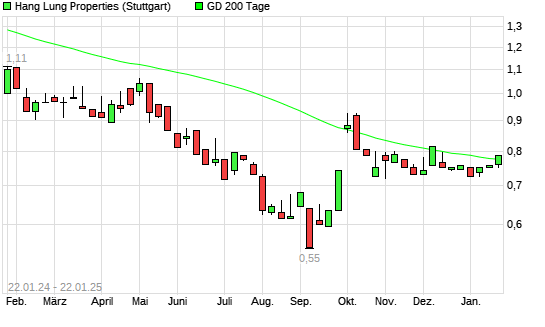 Mit dem Anstieg auf 0,79 EUR hat die Hang Lung Properties-Aktie am 21.01.2025 die 200-Tage-Linie nach oben gekreuzt.Die Hang Lung Properties-Aktie befand sich seit dem 08.10.2024 im langfristigen ...weiterlesen
