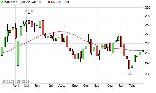 Mit dem Anstieg auf 255,00 EUR hat die Hannover Rück-Aktie am 24.02.2026 die 100-Tage-Linie nach oben gekreuzt.
