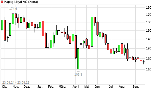 Mit dem Rücksetzer auf 115,40 EUR hat die Hapag-Lloyd-Aktie (ISIN DE000HLAG475) am 22.09.2025 ein neues 12-Monats-Tief erreicht und damit den Kurs vom 11.09.2025 eingestellt.